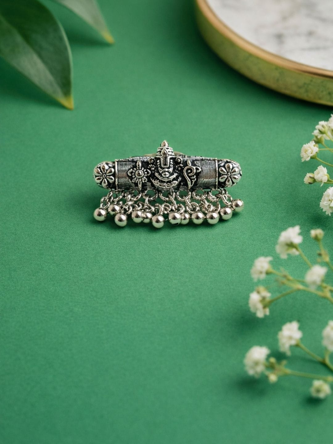This oxidized temple ring features intricate detailing inspired by heritage motifs, finished with delicate ghungroo charms that create a graceful, festive look.
