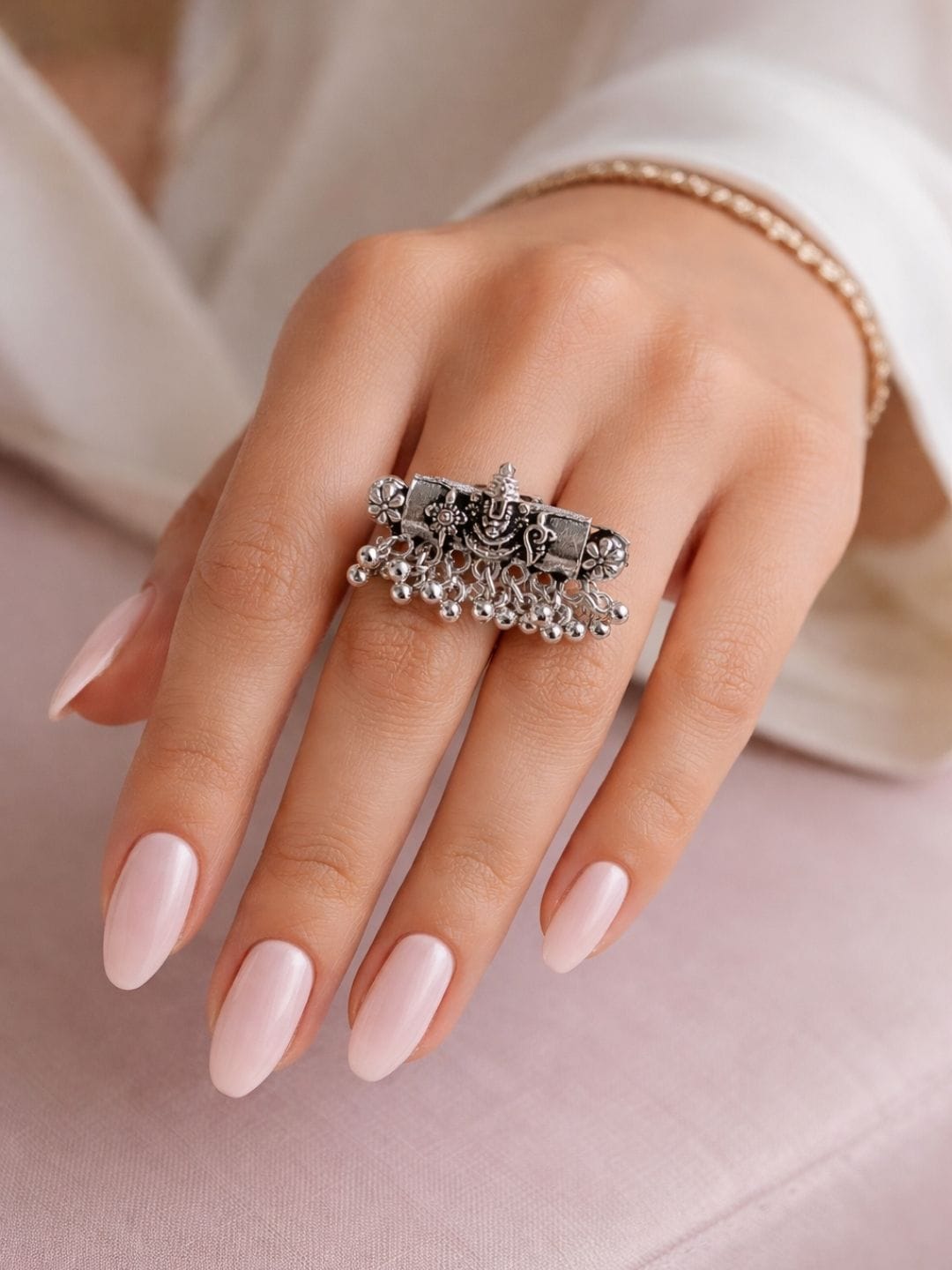 Tirupati Balaji oxidized temple ring with ghungroo danglers on woman handDivine Balaji Ghungroo Oxidized Ring