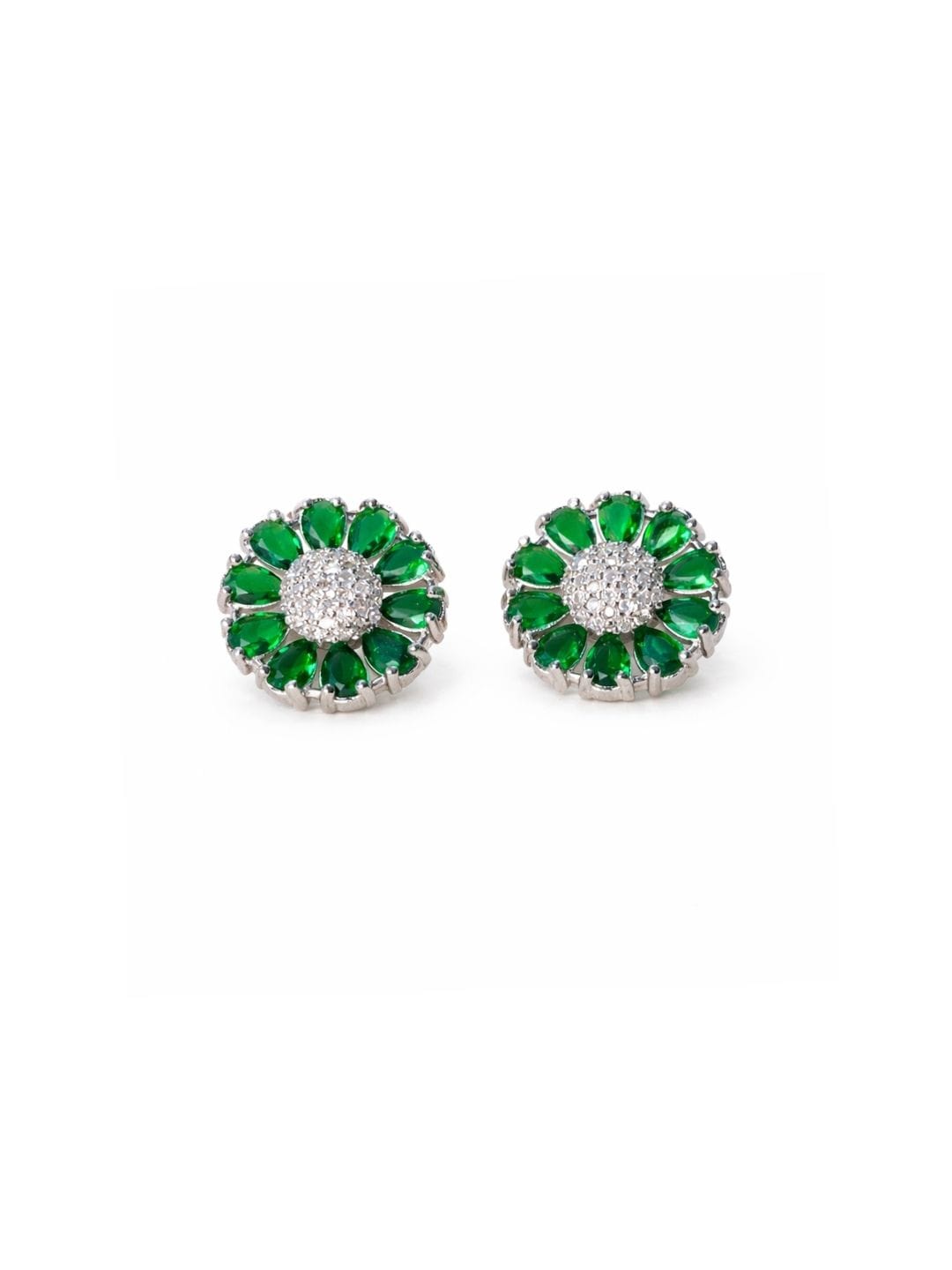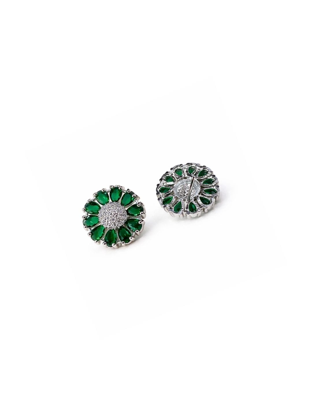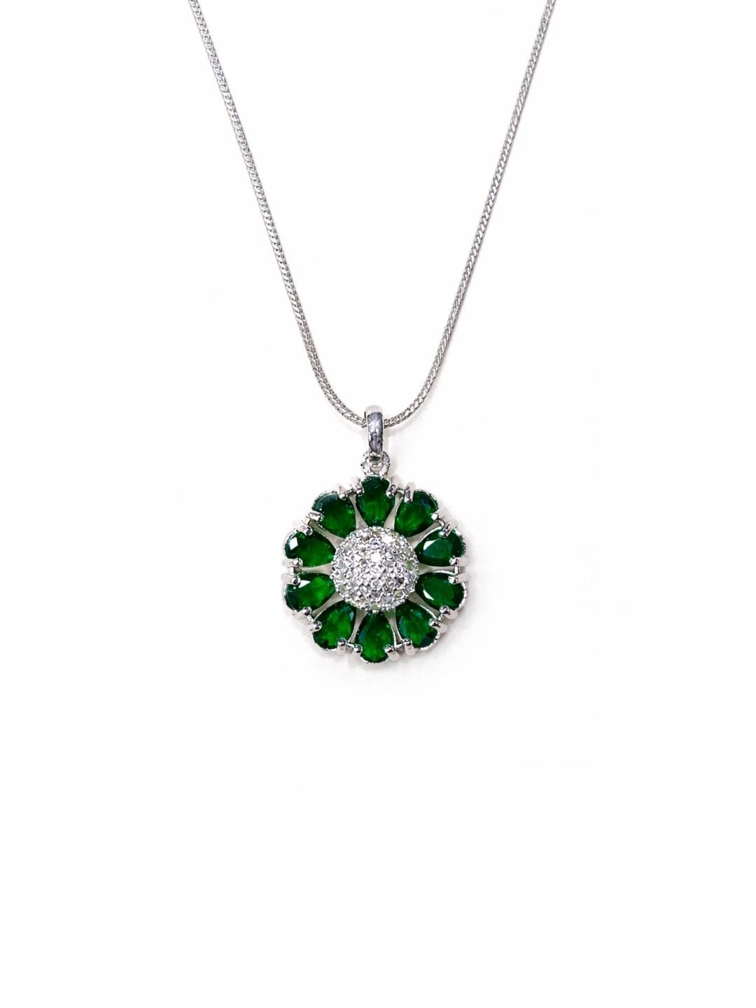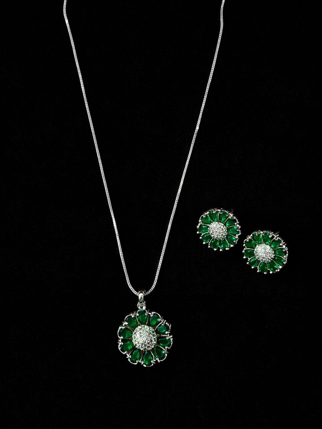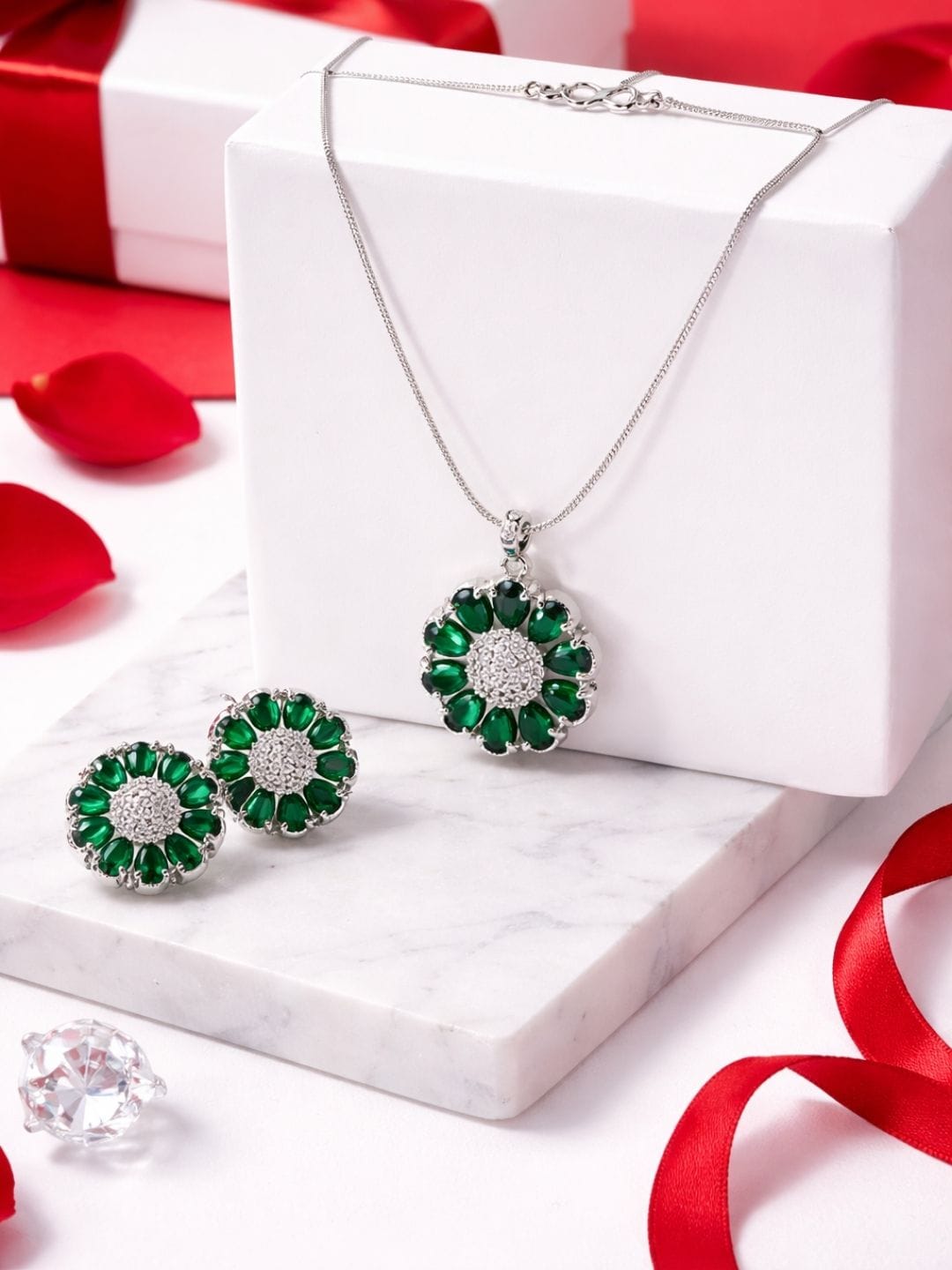 Elevate your elegance with this sterling silver necklace set, beautifully crafted with emerald green American diamonds and a sparkling central cluster. The floral-inspired pendant paired with matching stud earrings creates a timeless silhouette, perfect for festive occasions, evening wear, and refined everyday styling. A classic piece designed to shine effortlessly.