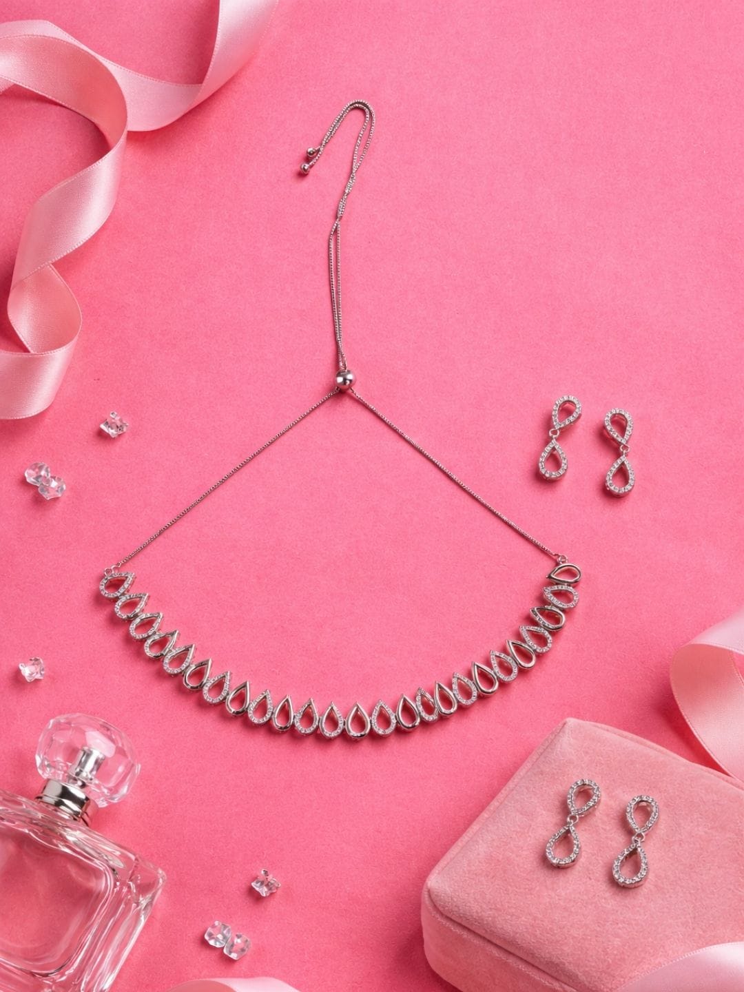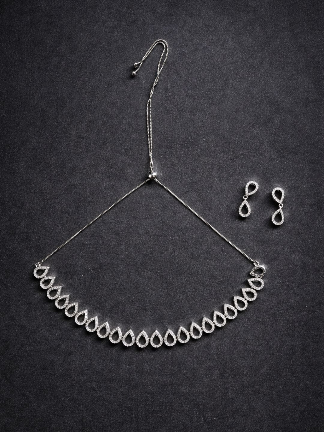 Elevate your style with this elegant American Diamond necklace and earrings set featuring a delicate teardrop design and adjustable chain. Lightweight, classy and perfect for weddings, parties, festive occasions and modern ethnic looks.