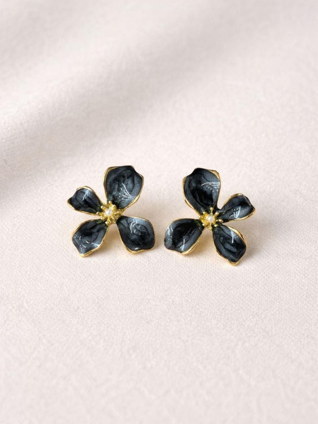 Elegant floral stud earrings featuring glossy black enamel petals outlined in gold — a refined statement that blends modern charm with timeless elegance.