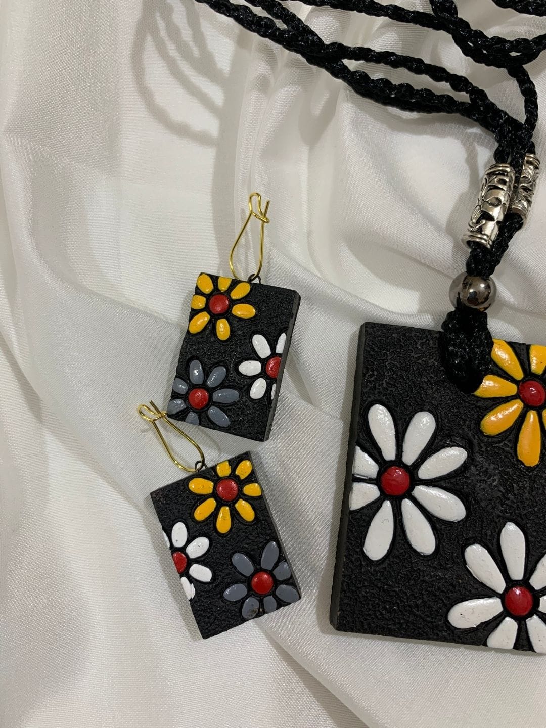 Add a cheerful touch to your outfit with this hand-painted floral necklace set, featuring bold daisy motifs on a sleek black base.
