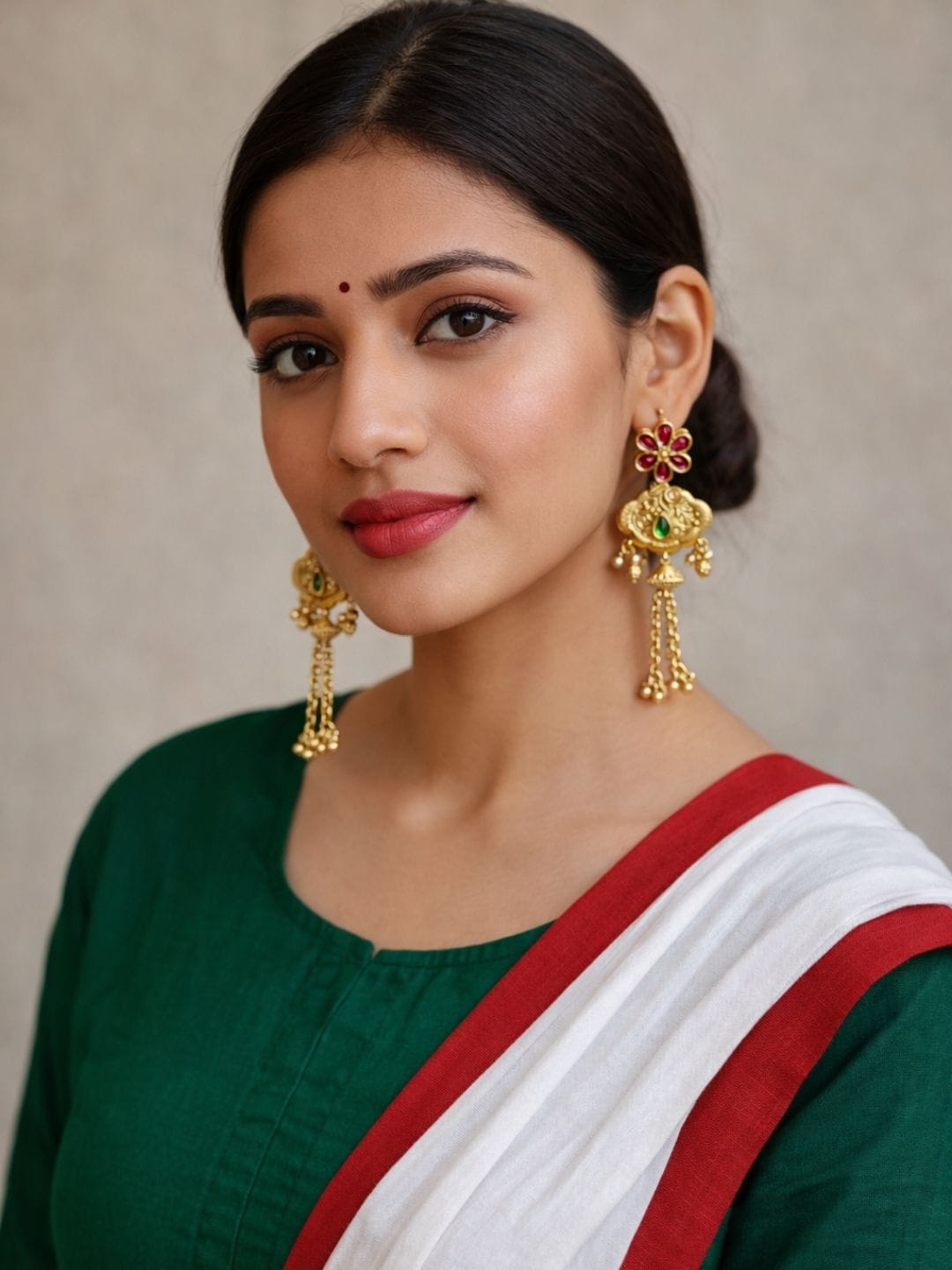 - Colour & Dimension: Gold, Red & Green • Long drop earrings