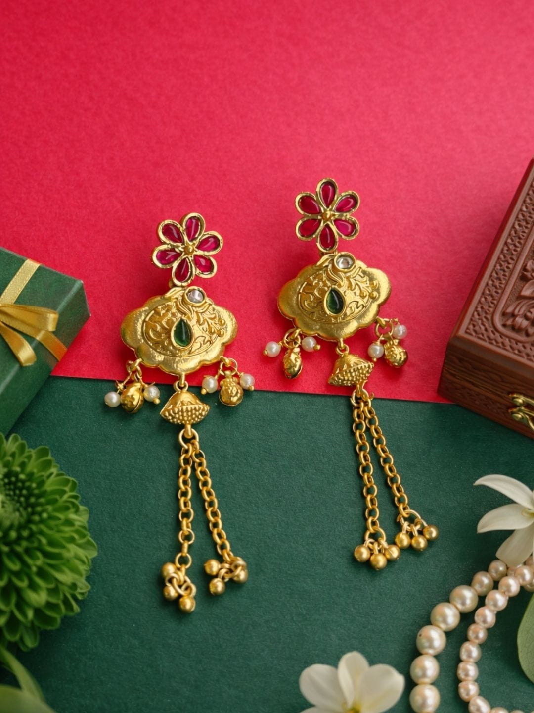 - Design: Floral kundan stud with engraved gold motif, green teardrop stone & chain tassel drops