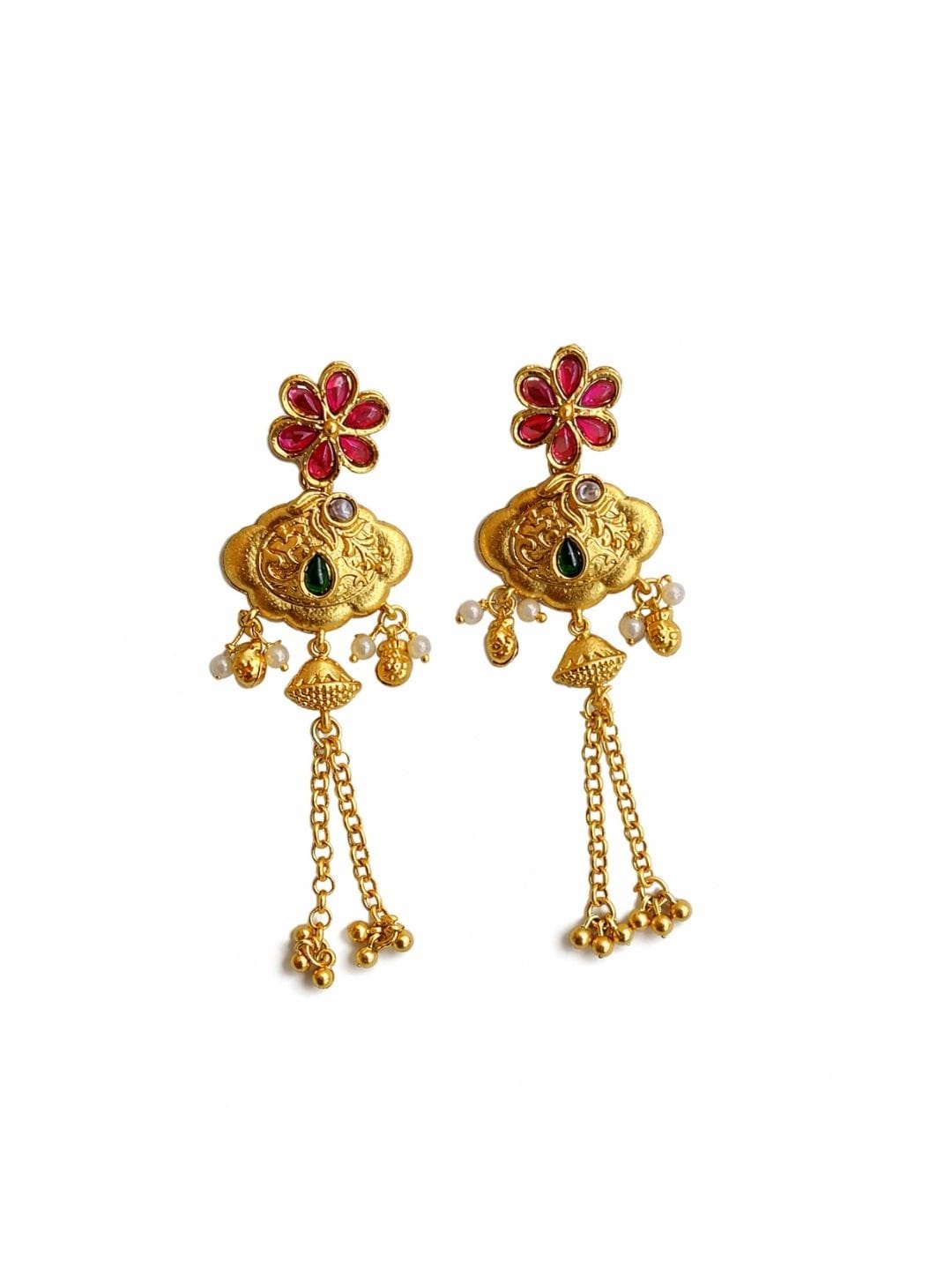 Floral-inspired kundan earrings featuring rich gold detailing, ruby-toned flower studs, a central green stone accent, and elegant chain danglers — a regal piece with vintage charm.