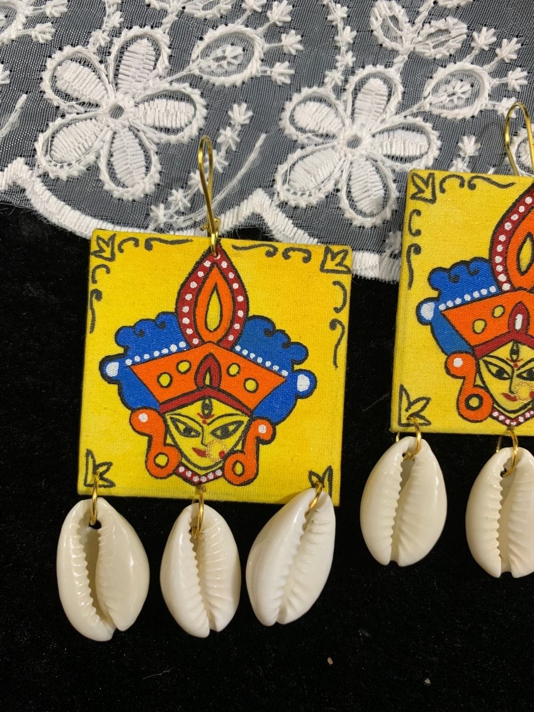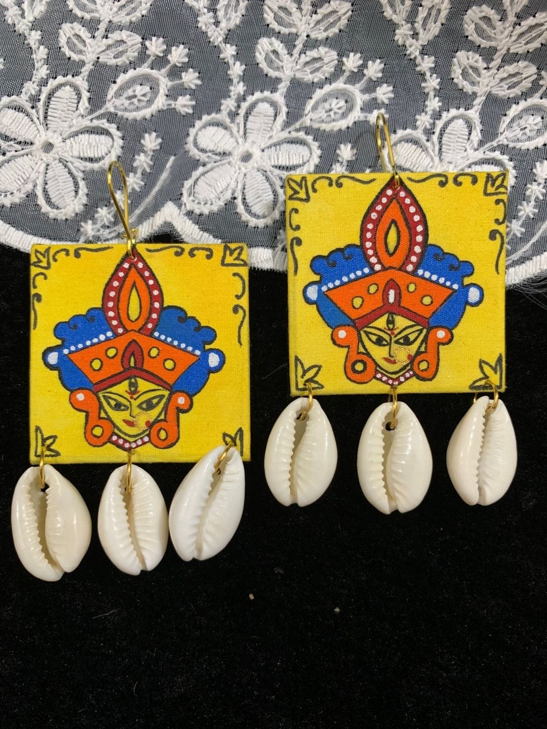 • Design: Square fabric base with hand-painted Goddess Durga artwork in bright colors, finished with three dangling cowrie shells on each earring.