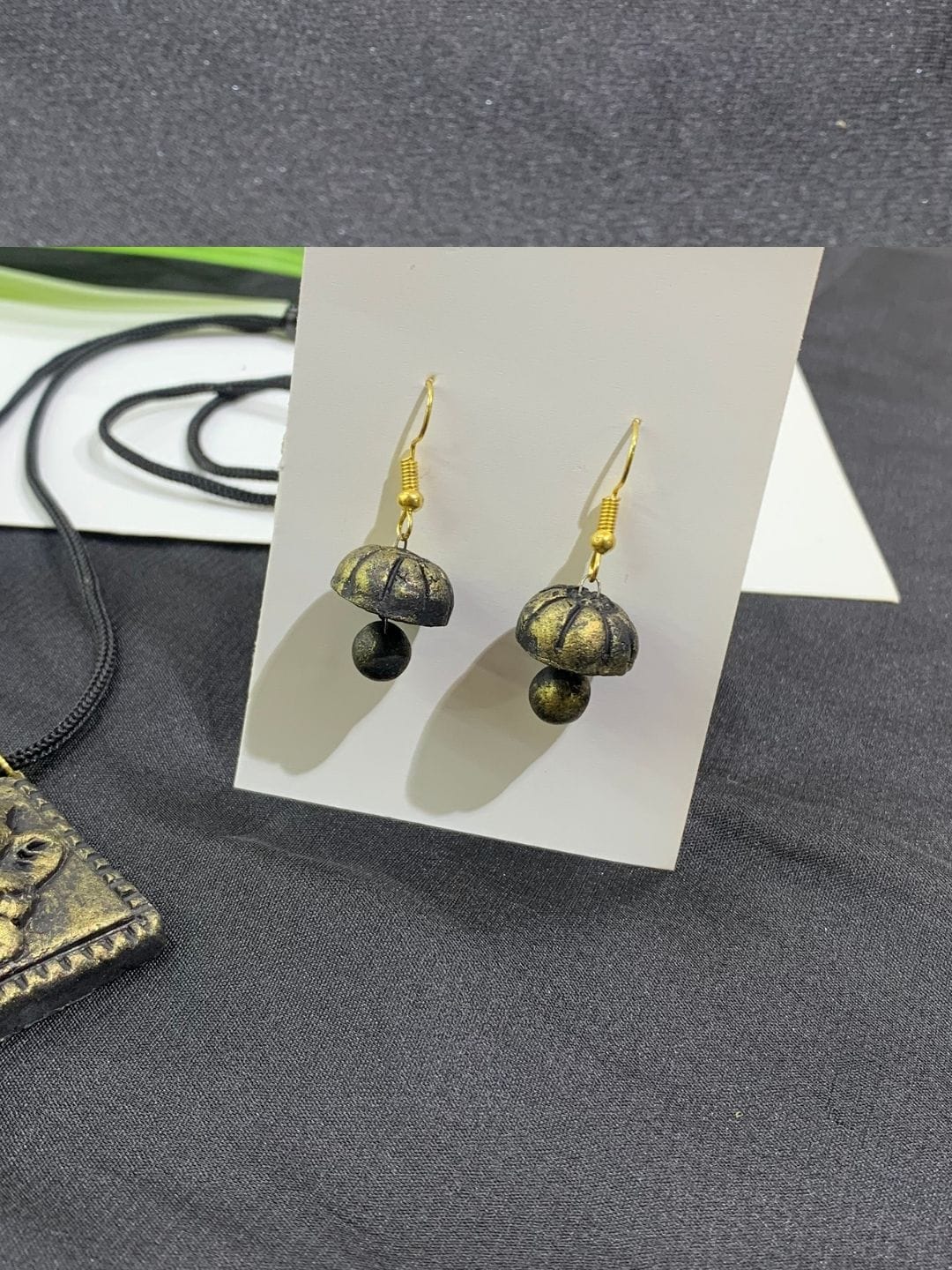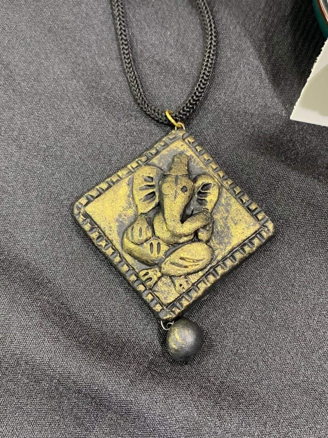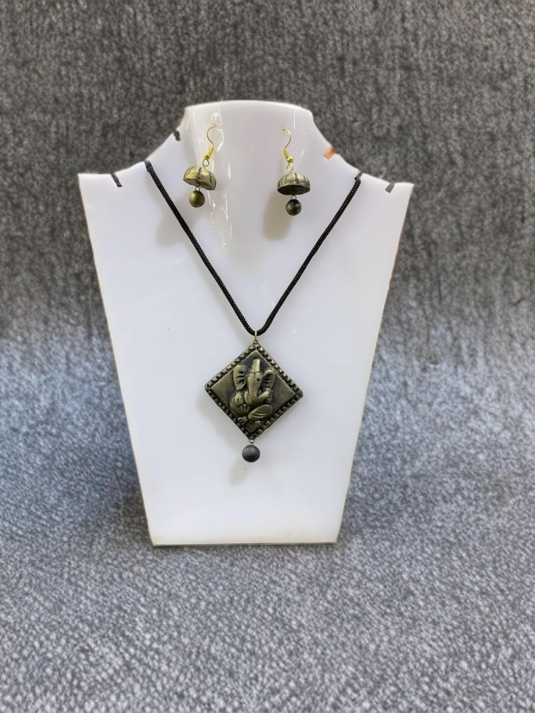 This divine terracotta necklace features a beautifully sculpted Lord Ganesha pendant, symbolizing wisdom and prosperity. Handcrafted in an antique gold tone, it embodies timeless artistry and ethnic charm for every occasion.