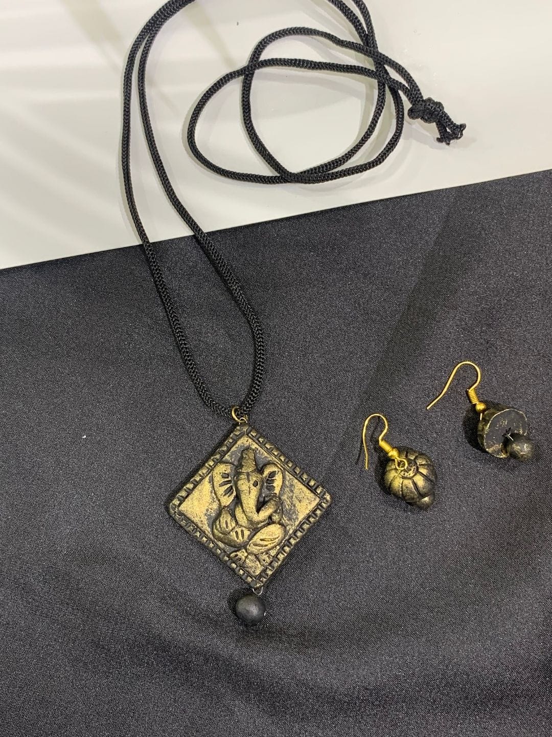 Handcrafted Lord Ganesha Terracotta Necklace Set – Antique Gold Finish