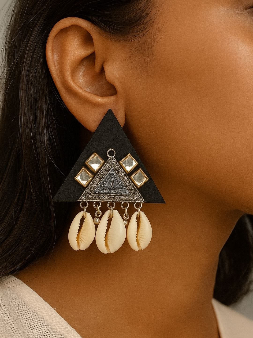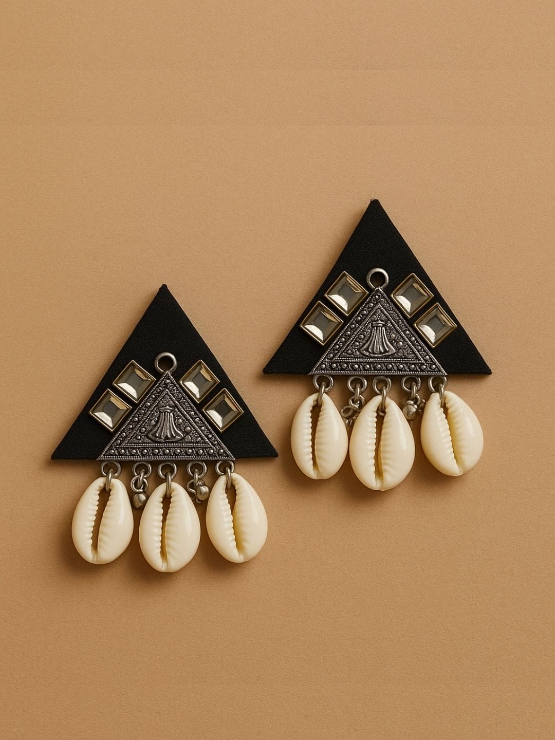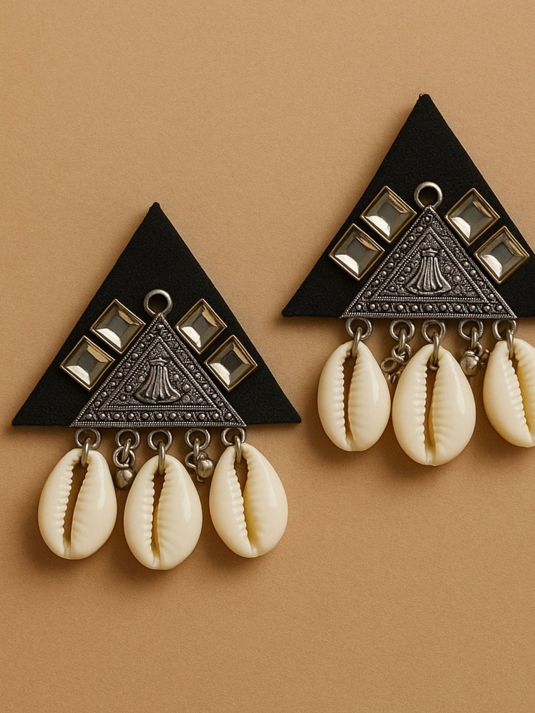 Boho-chic triangle earrings featuring oxidized detailing, mirror accents, and natural cowrie shells for a bold ethnic look.