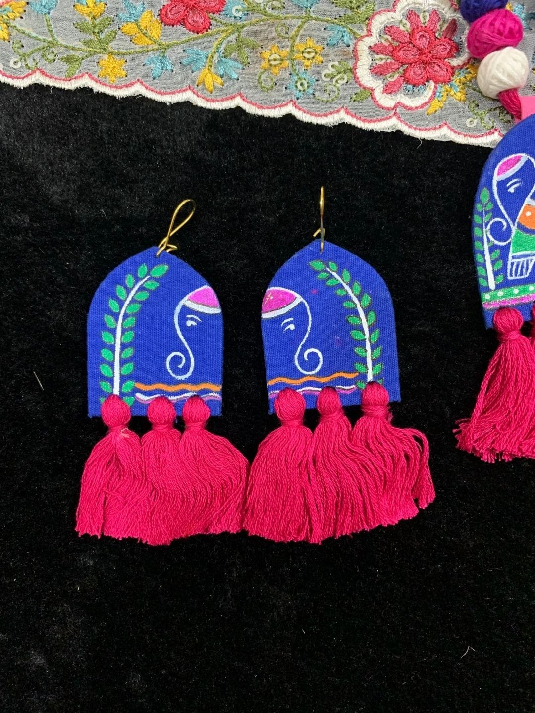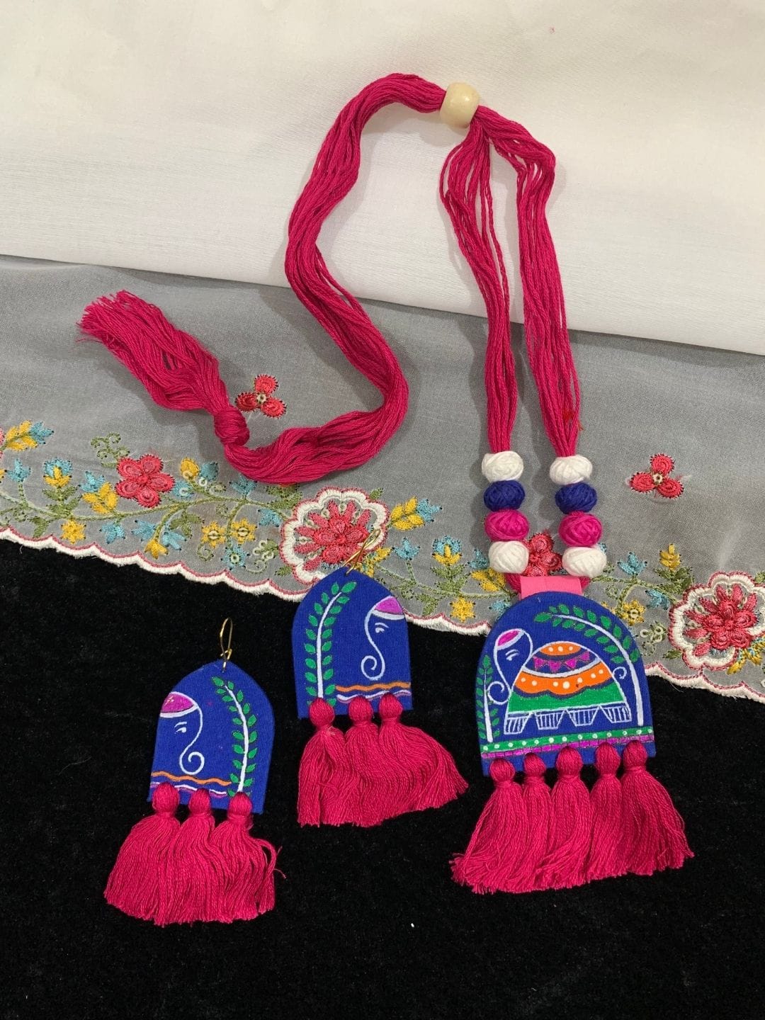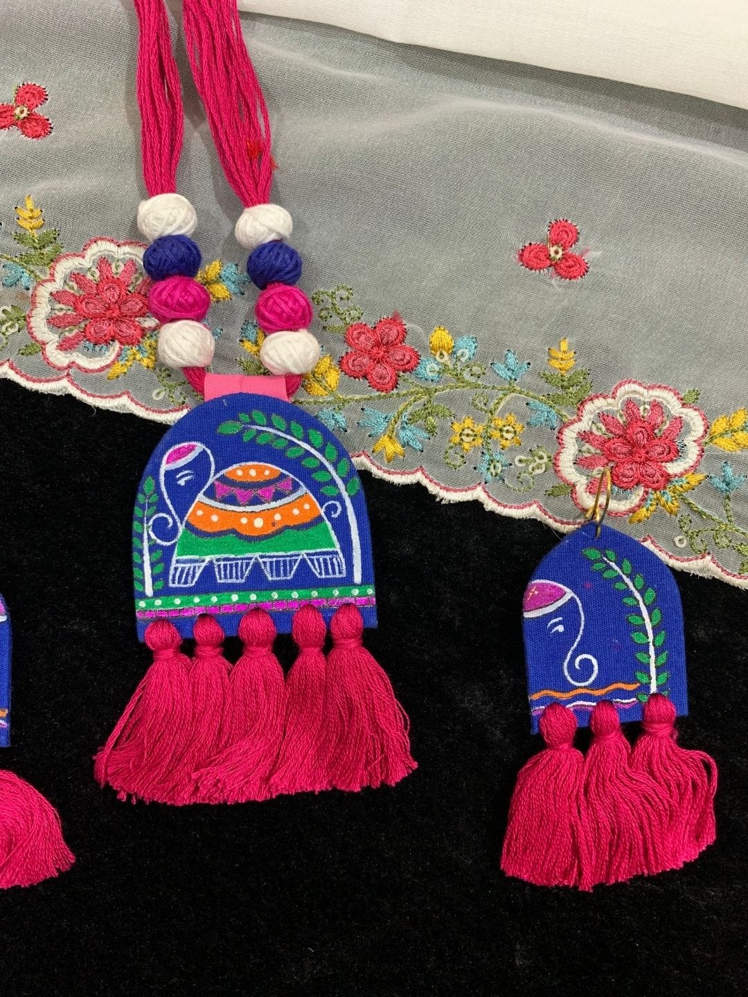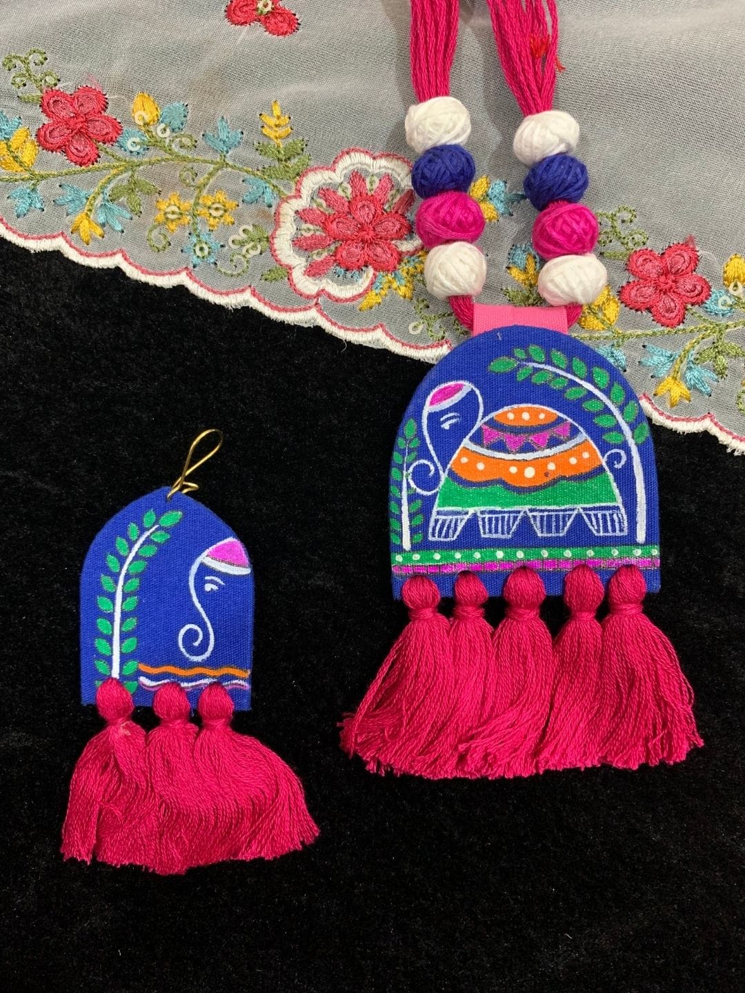 A vibrant handpainted fabric jewelry set featuring playful elephant motifs and tassels—perfect for adding a boho twist to your ethnic look.