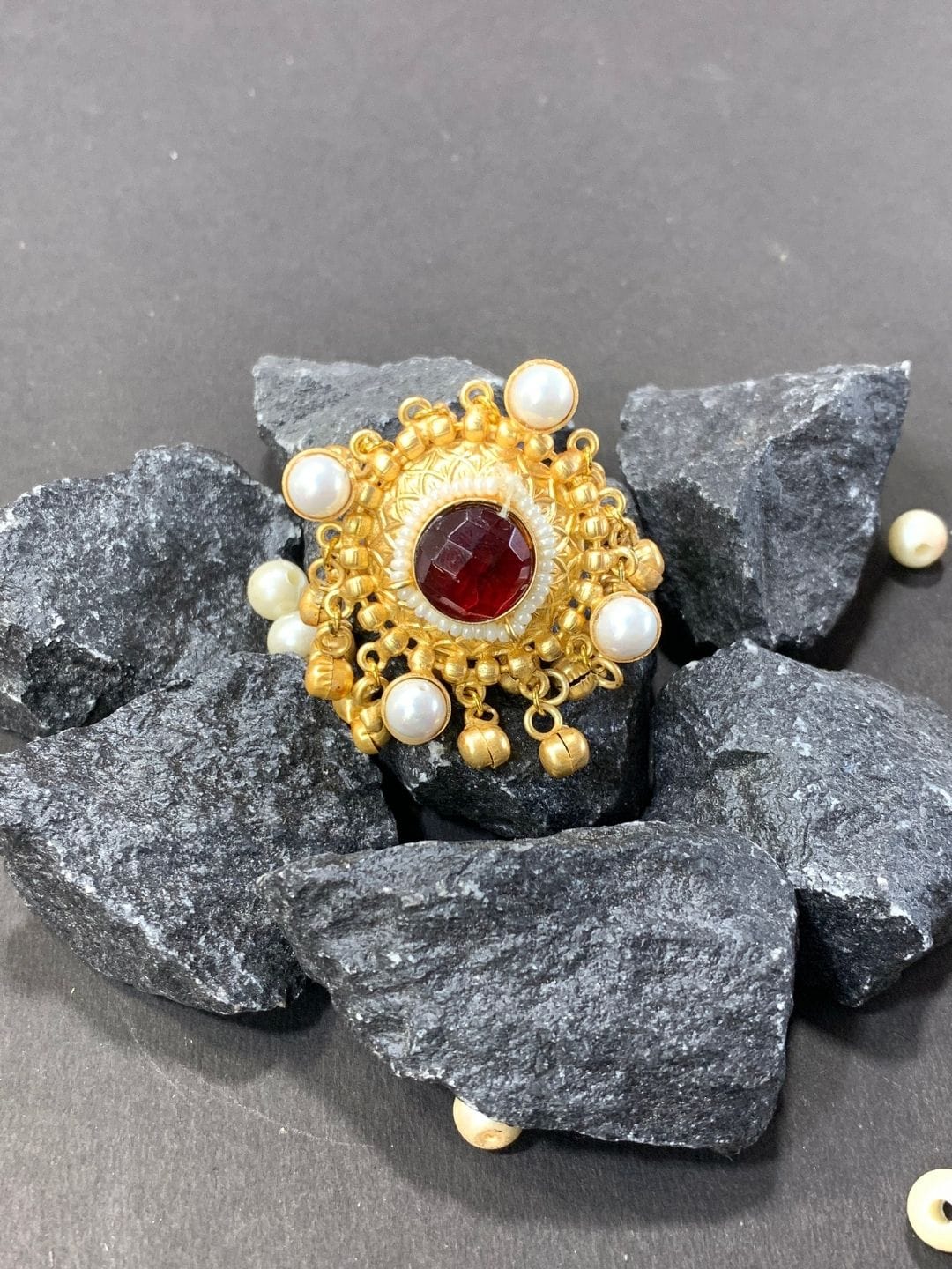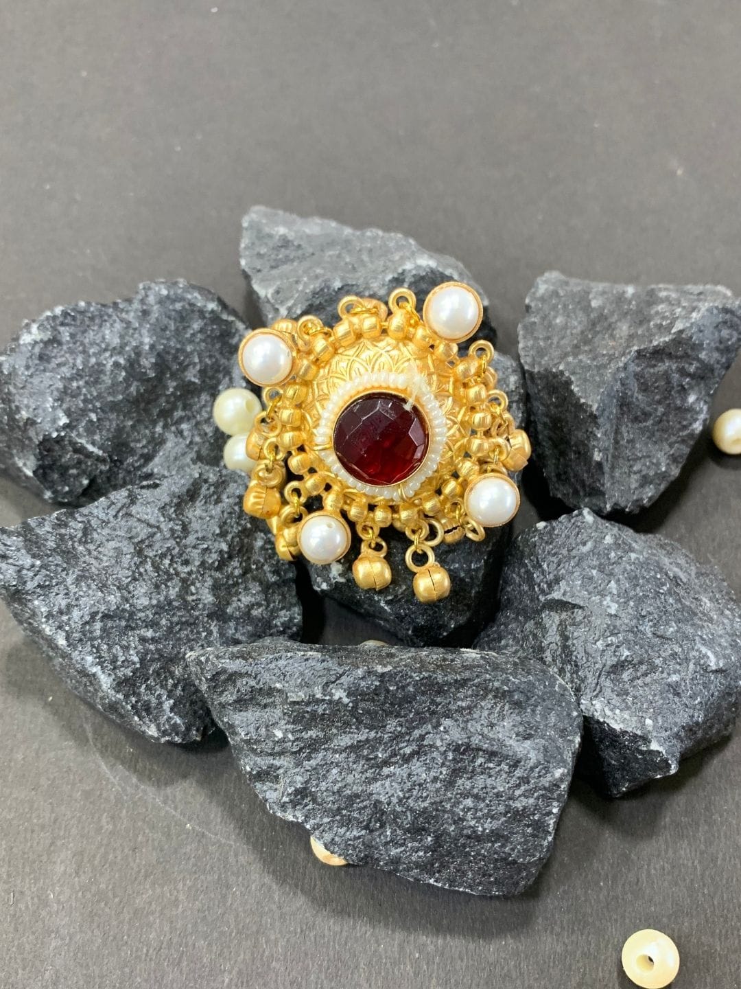 A royal Kashmiri-style brass ring featuring a deep maroon premium stone at the centre, surrounded by pearl drops and antique detailing — bold, festive, and beautifully traditional.