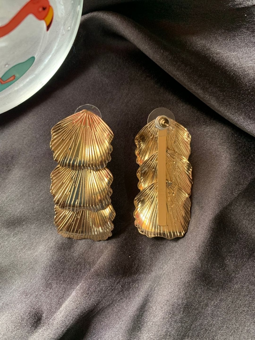 Gold-plated statement earrings featuring a layered shell leaf design. Lightweight, elegant, and perfect for parties, weddings, and festive looks.