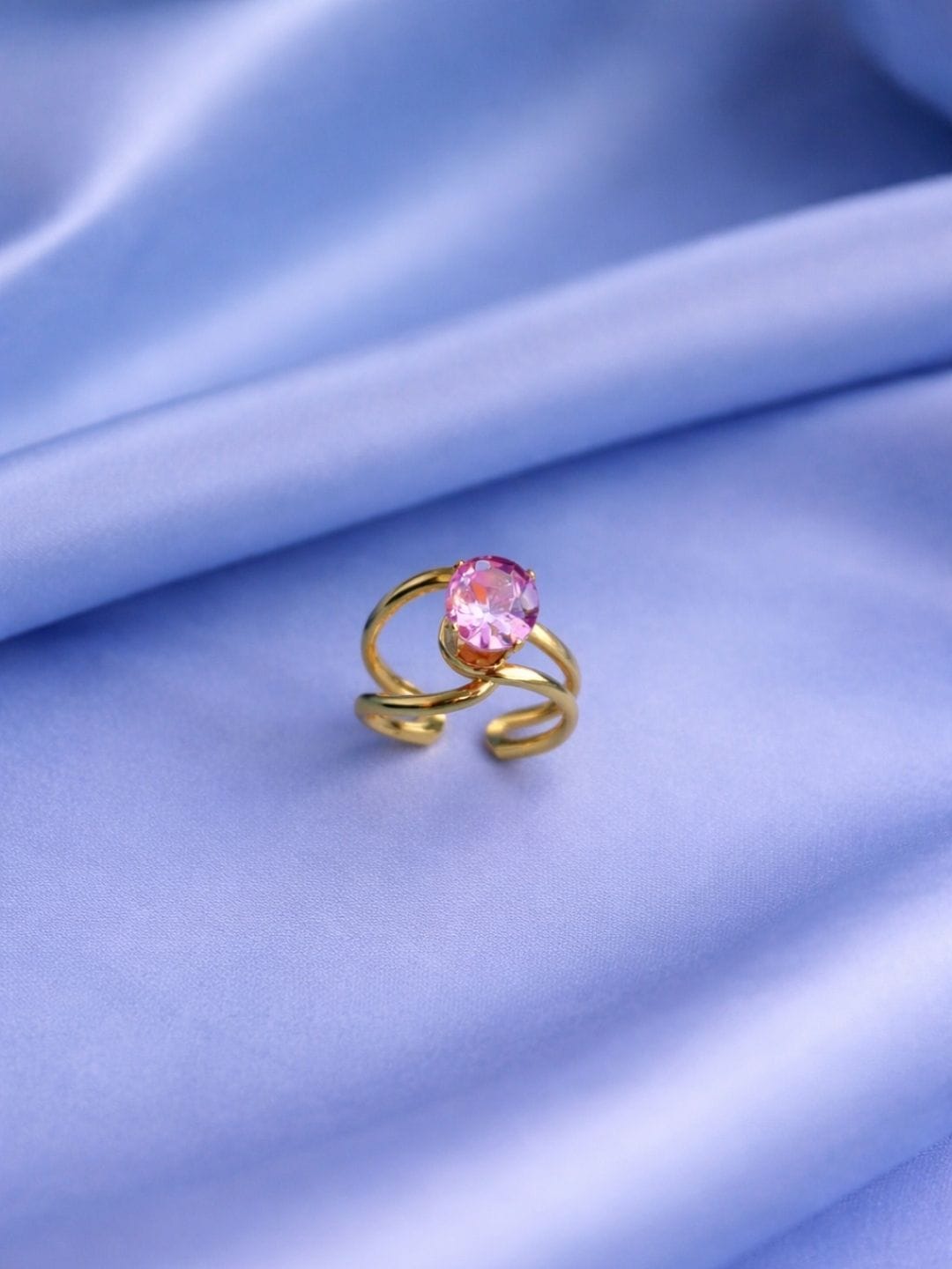 A delicate gold-tone adjustable ring featuring a soft pink American Diamond (AD) stone set on an elegant twisted loop design. Finished with an anti-tarnish coating, this ring adds subtle sparkle and modern charm to everyday and occasion looks.