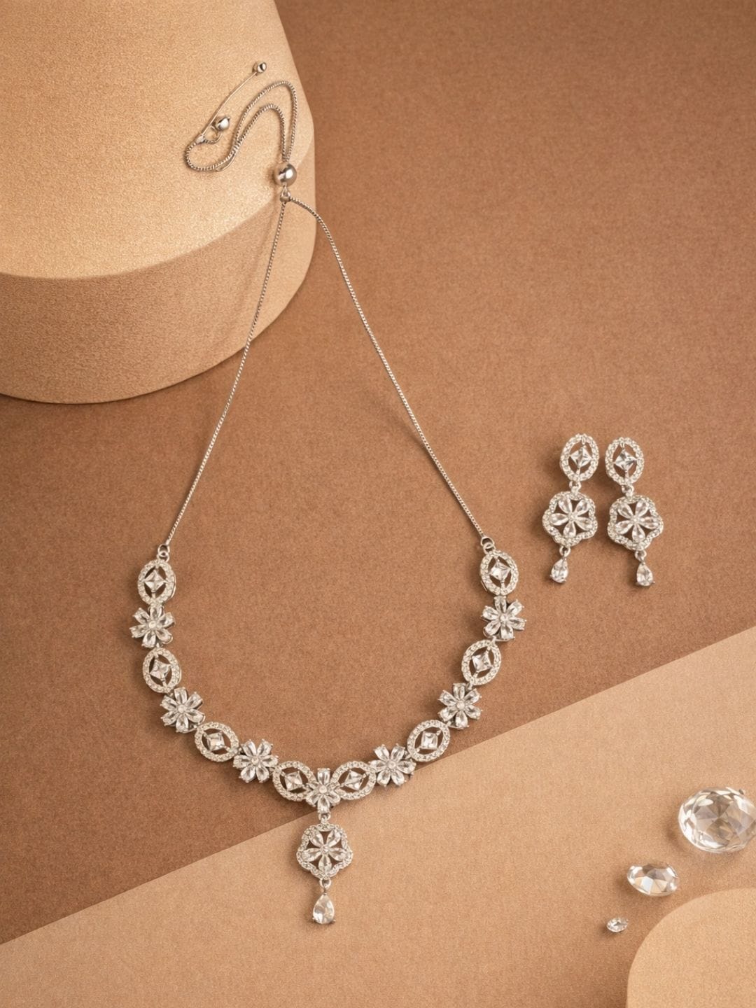 Add graceful sparkle to your look with this American Diamond floral necklace and earrings set featuring delicate stone detailing and an elegant design. Lightweight and stylish, perfect for weddings, parties, festive occasions and modern ethnic outfits.