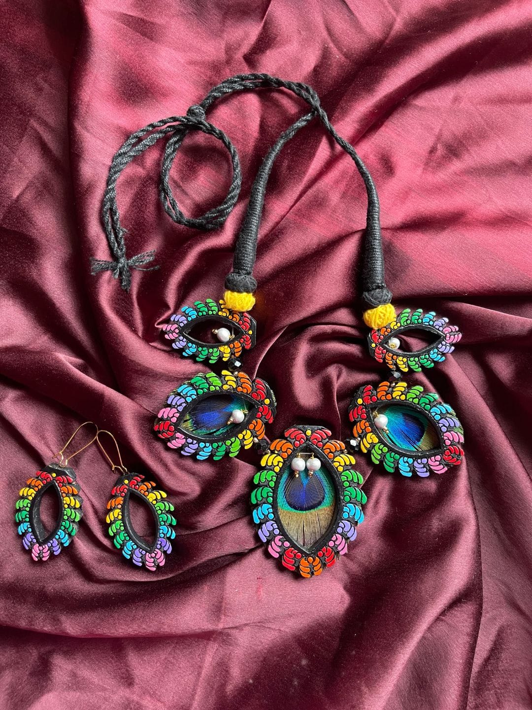 Make a bold statement with this handcrafted necklace featuring real peacock feathers framed in colorful hand-painted motifs.