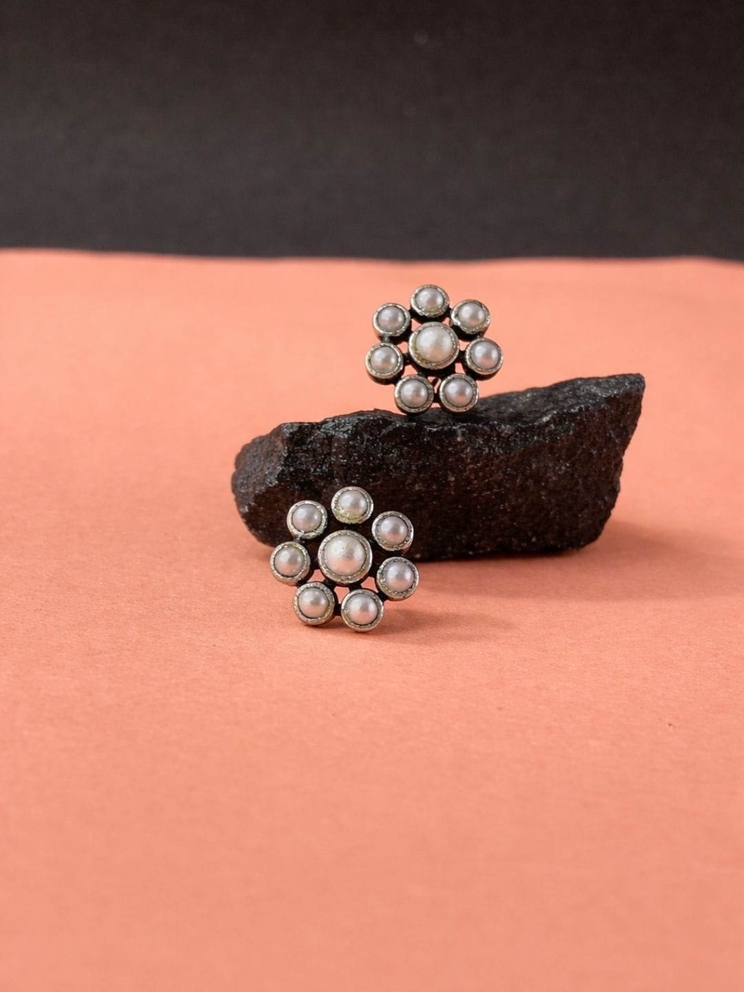 Elegant oxidised silver stud earrings featuring a classic pearl cluster design — a timeless piece that adds subtle charm and sophistication to everyday and festive looks.
