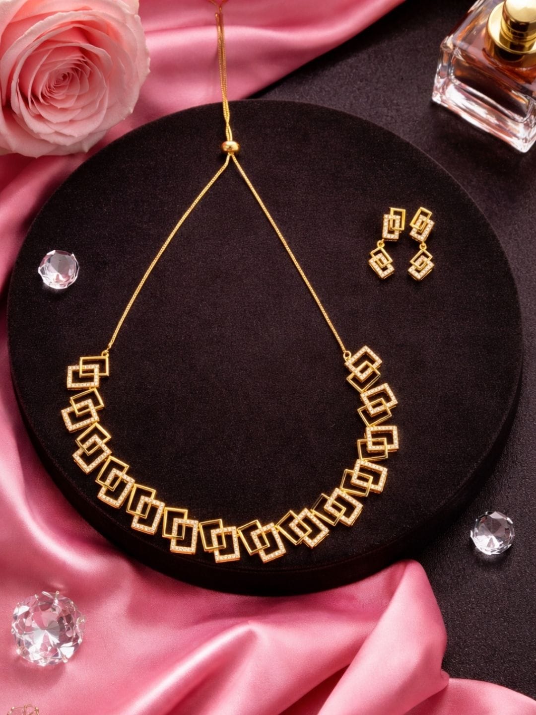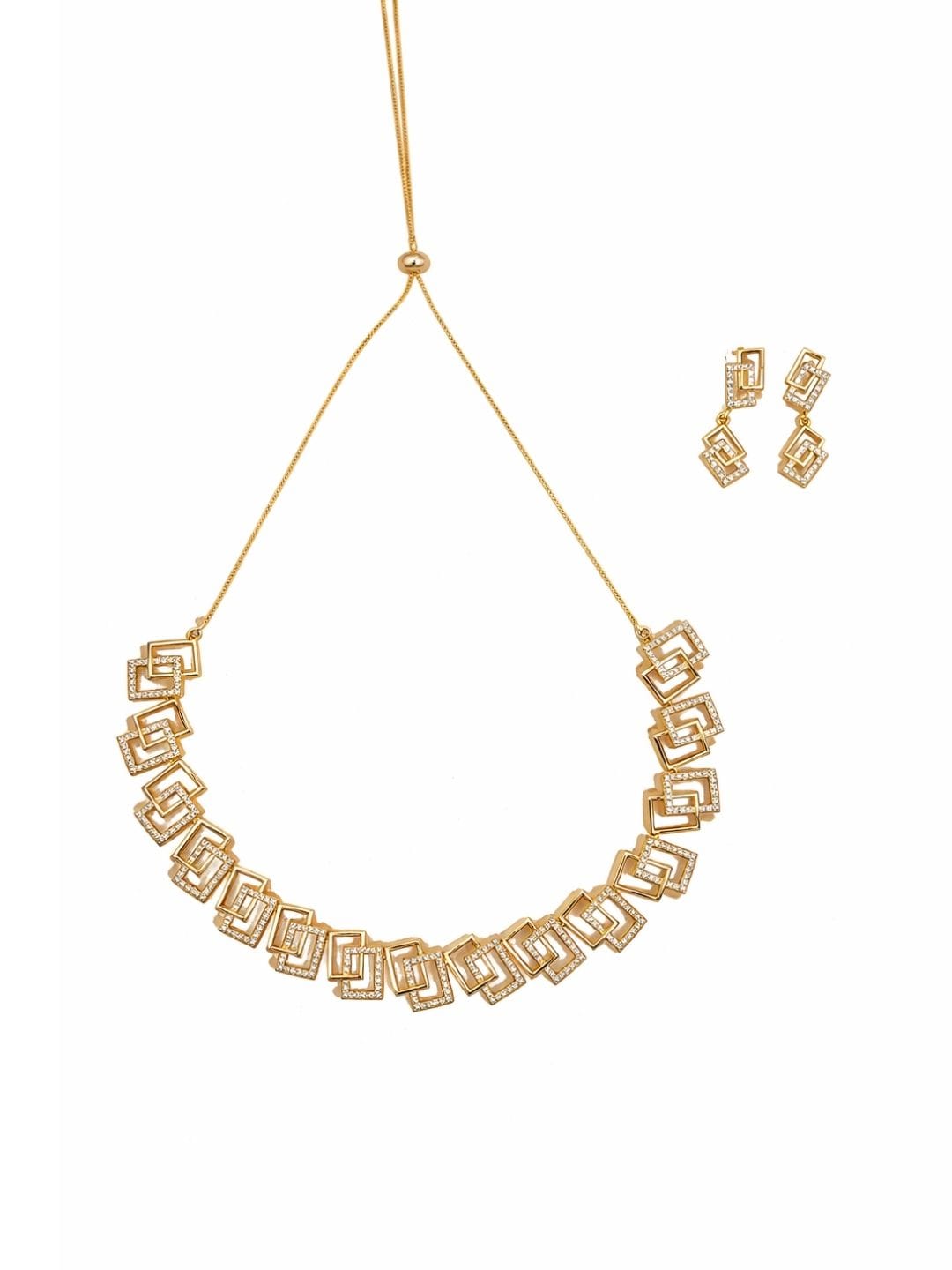 Gold tone American diamond geometric necklace and earrings set with square design, adjustable AD party wear jewellery for womenRegalia Gold Square Necklace Set