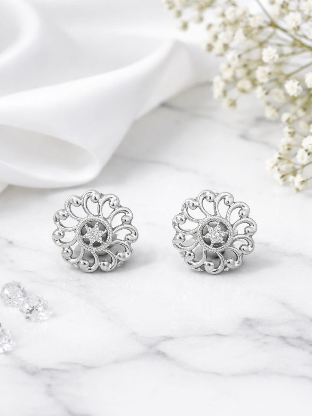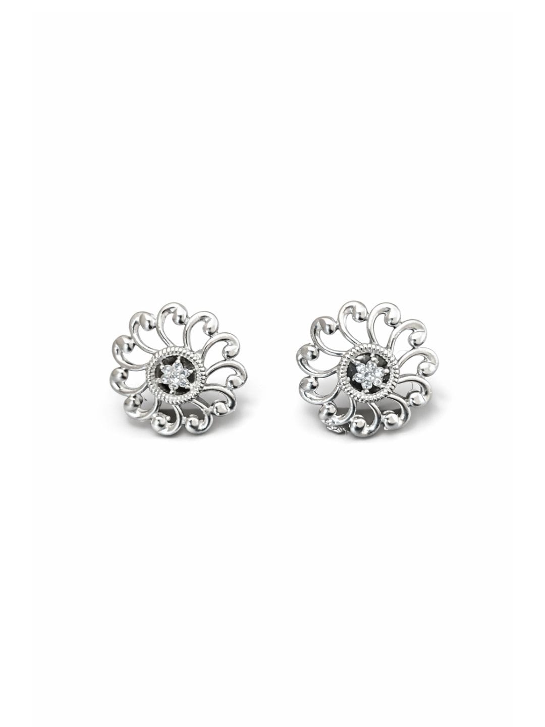 Add timeless elegance to your look with these sterling silver stud earrings, crafted in a delicate sunburst floral design. Featuring fine detailing and a subtle central sparkle, these earrings are perfect for everyday wear, office looks, and understated festive styling. A versatile classic that never goes out of style.